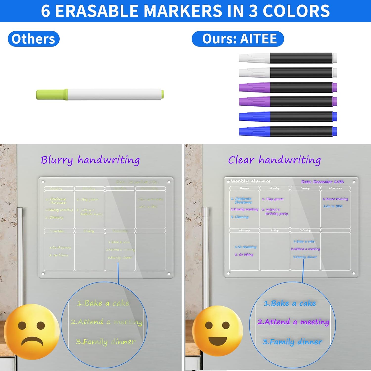 Some darker fridge finishes may reduce contrast with certain marker colors; we recommend using bright markers and good lighting for the clearest visibility.